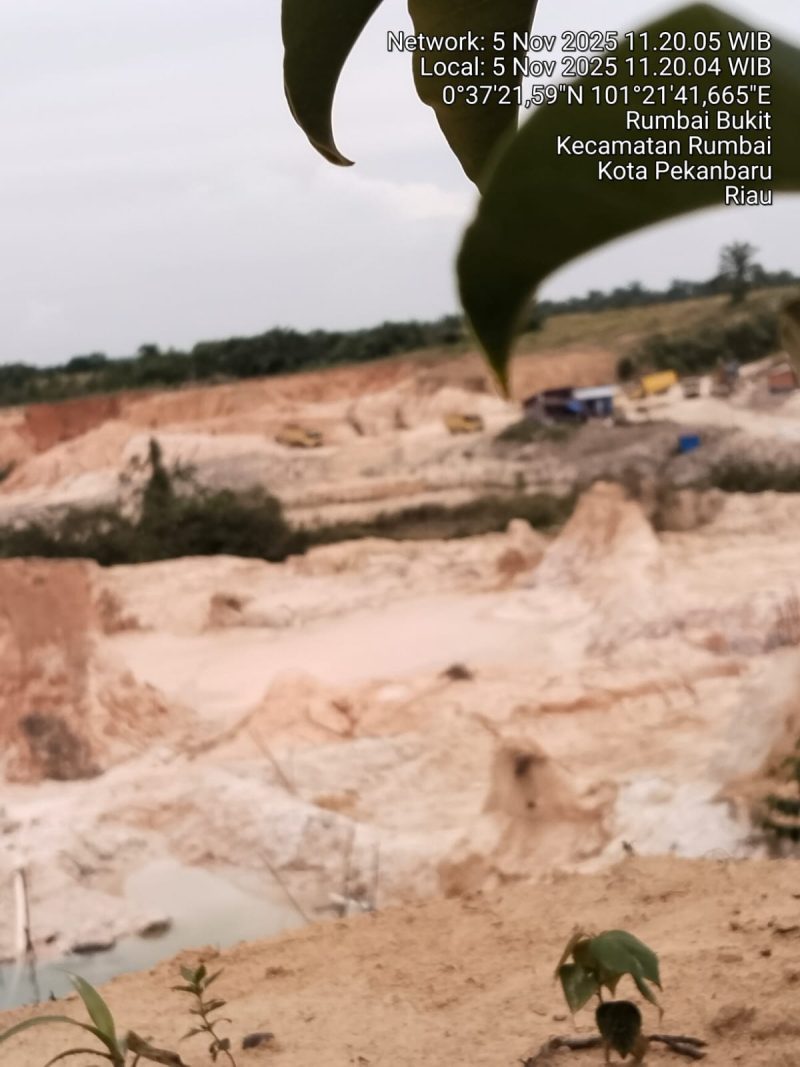 Dari hasil pantauan lapangan di kawasan Rumbai Bukit, Kecamatan Rumbai, terlihat aktivitas alat berat jenis ekskavator tengah mengeruk dinding bukit yang telah terbelah. Lumpur dari galian itu mengalir melalui parit-parit kecil menuju aliran sungai di bawahnya.