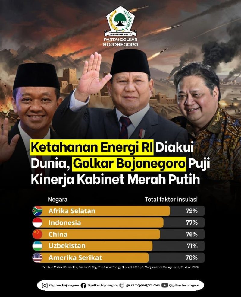 BOJONEGORO –Rilispublik | Di saat banyak negara menghadapi tekanan berat akibat krisis energi global, Indonesia justru mencatatkan capaian yang berbanding terbalik. Laporan terbaru dari JPMorgan Chase menempatkan Indonesia sebagai salah satu negara dengan ketahanan energi terkuat di dunia. Capaian ini bukan hanya menjadi catatan statistik, tetapi juga sinyal bahwa fondasi energi nasional mampu bertahan di tengah gejolak geopolitik dan lonjakan harga energi global.