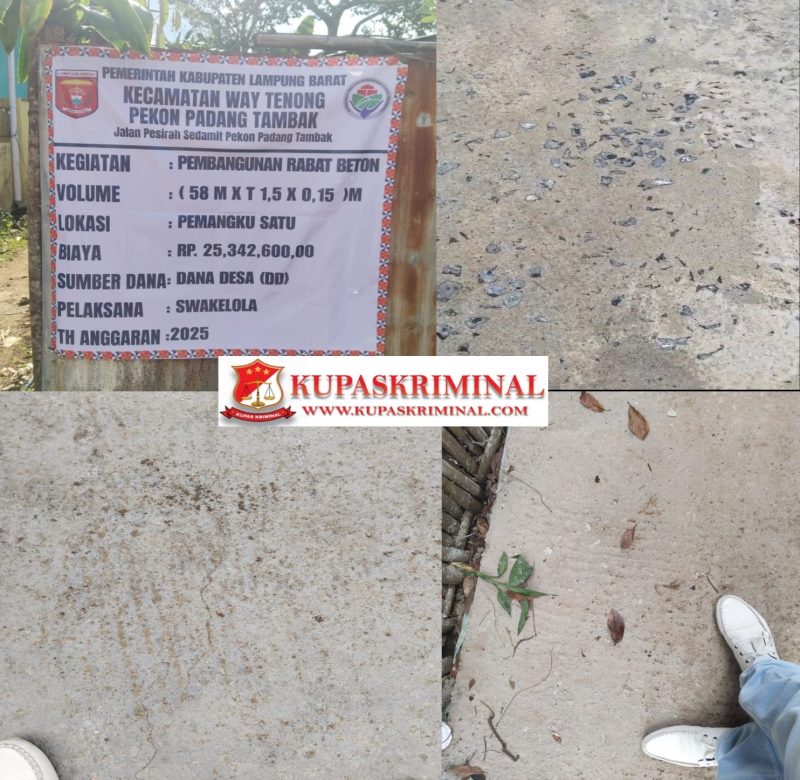 Lampung Barat, Rilis publik – Aroma busuk dugaan penyimpangan dana desa kembali tercium di Kabupaten Lampung Barat, Kali ini mencuat dari Pekon Padang Tambak, Kecamatan Way Tenong, tempat proyek pembangunan rabat beton yang bersumber dari Alokasi Dana Desa (ADD) menjadi buah bibir warga.