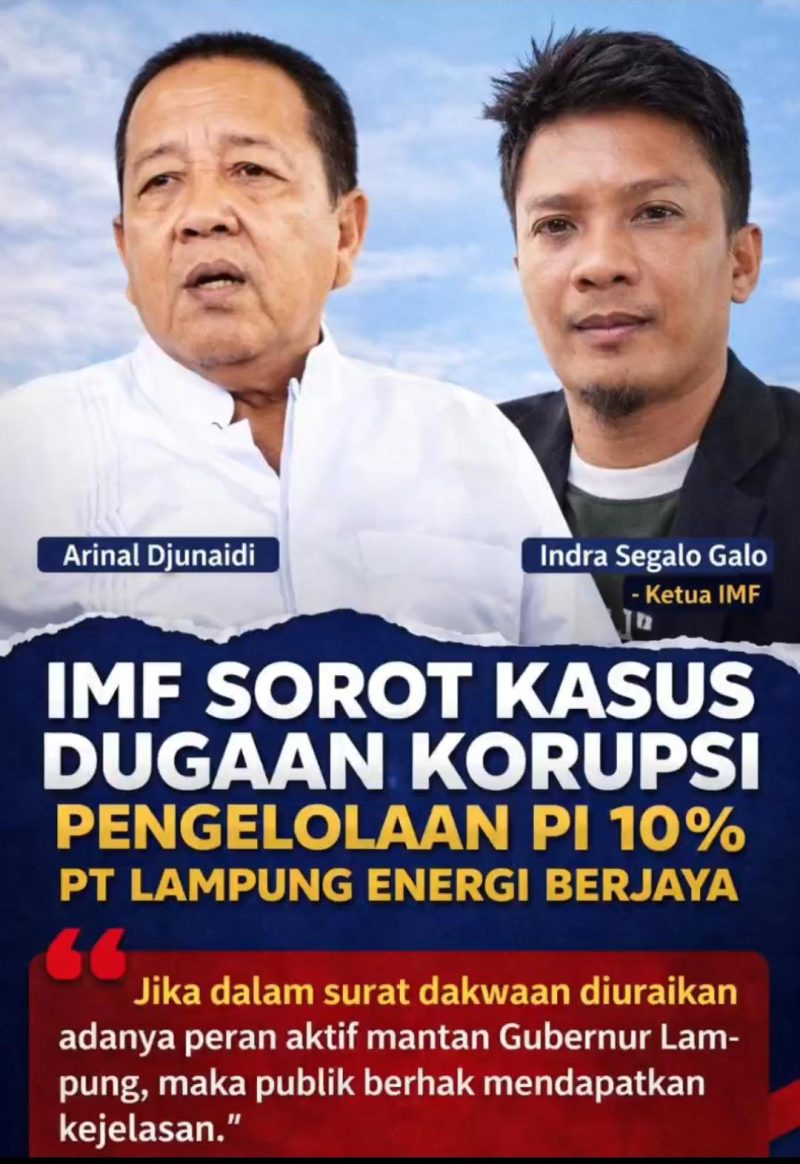 BANDAR LAMPUNG, Rilis Publik — Integrity Media Forum (IMF) menyoroti perkembangan terbaru penanganan perkara dugaan korupsi pengelolaan dana Participating Interest (PI) 10 persen oleh PT Lampung Energi Berjaya (LEB), yang kini mulai menyeret nama mantan Gubernur Lampung Arinal Djunaidi sebagaimana terungkap dalam surat dakwaan Jaksa Penuntut Umum Kejaksaan Tinggi Lampung.
