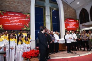 Menko Polkam di dampingi oleh Panglima TNI Jenderal Agus Subiyanto dan Kapolri Jenderal Pol. Listyo Sigit Prabowo. Peninjauan itu dalam rangka pemantauan pelaksanaan pengamanan Natal dan Tahun Baru 2025 dan Menyapa para Jemaah.