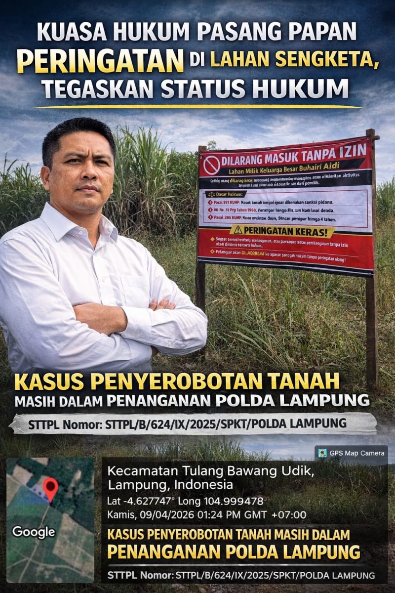 TULANG BAWANG BARAT, Rilis Publik– Kasus dugaan penyerobotan lahan di Tiyuh (Desa) Karta Tanjung Selamat, Kecamatan Tulang Bawang Udik, Kabupaten Tulang Bawang Barat (Tubaba), memasuki babak baru. Pada Kamis (09/04/2026), tim kuasa hukum pelapor melakukan tindakan tegas dengan memasang papan peringatan di lokasi objek sengketa.