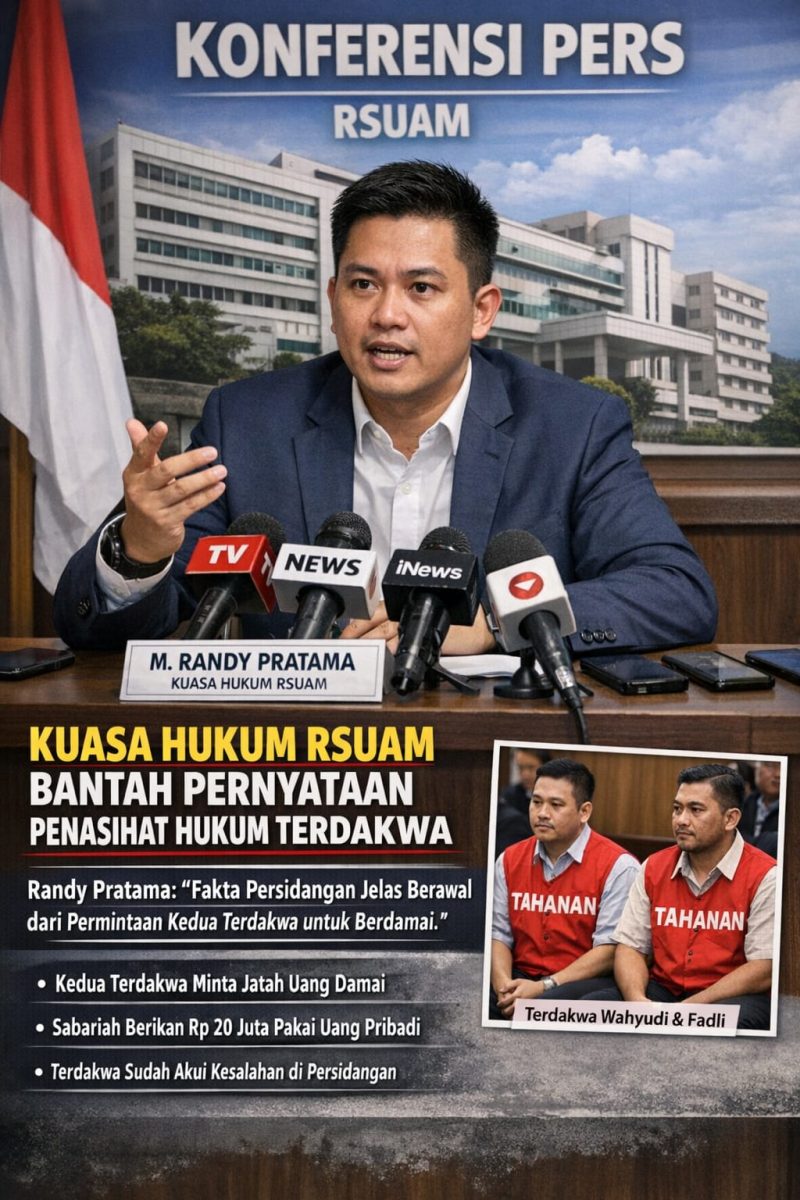 Bandar Lampung, Rilis Publik – Kuasa Hukum Rumah Sakit Umum Abdul Muluk (RSUDAM),M. Randy Pratama, meluruskan pemberitaan yang beredar terkait pernyataan penasihat hukum terdakwa, Indah Meylan, dalam perkara dugaan pemerasan dan pengancaman terhadap RSUAM.