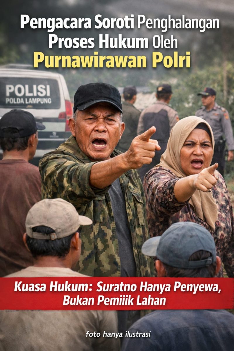 TULANG BAWANG BARAT, Rilis Publik – Perkembangan terbaru muncul dalam kasus dugaan penyerobotan lahan di Desa Karta Tanjung Selamat, Kecamatan Tulang Bawang Udik, Kabupaten Tulang Bawang Barat (Tubaba). Tindakan pengusiran pekerja yang diduga dilakukan oleh seorang purnawirawan Polri bernama Suratno, kini menuai sorotan tajam dari kuasa hukum pelapor.