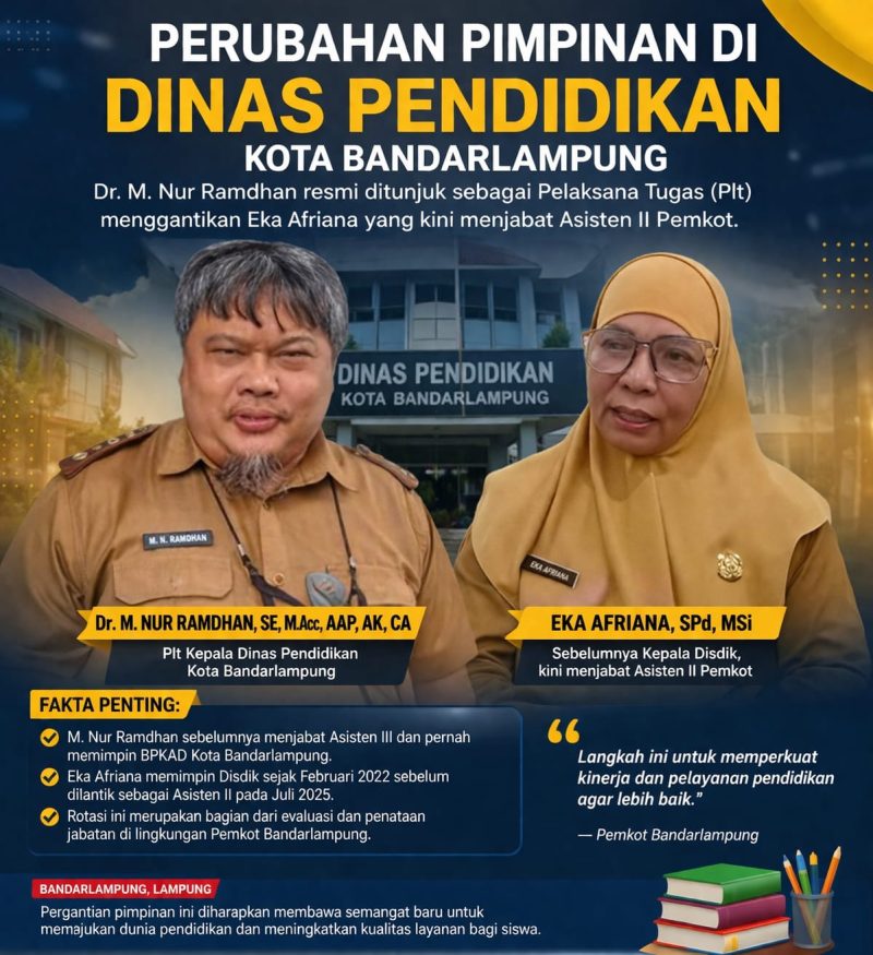 Pergantian ini diharapkan membawa semangat baru serta meningkatkan kualitas pelayanan pendidikan di Kota Bandarlampung, sekaligus memperkuat tata kelola pemerintahan yang profesional dan berorientasi pada kinerja.