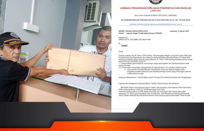 CV. Kalembo Ade Mautama resmi dilaporkan ke Polresta Bandarlampung. Tak tanggung-tanggung, kerugian mencapai ratusan juta rupiah. Laporan tersebut tertuang dalam nomor surat STTLP/B/1866/XII/2024/SPKT/POLRESTA BANDARLAMPUNG/POLDA LAMPUNG.
