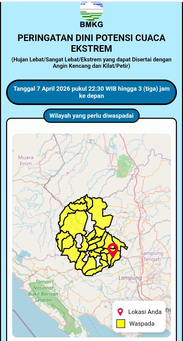 Lampung Utara, Rilis Publik – Badan Meteorologi, Klimatologi, dan Geofisika (BMKG) telah mengeluarkan peringatan dini cuaca ekstrem untuk wilayah Lampung Utara dan Way Kanan pada tanggal 7 April 2026 pukul 22:30 WIB hingga 3 jam ke depan.