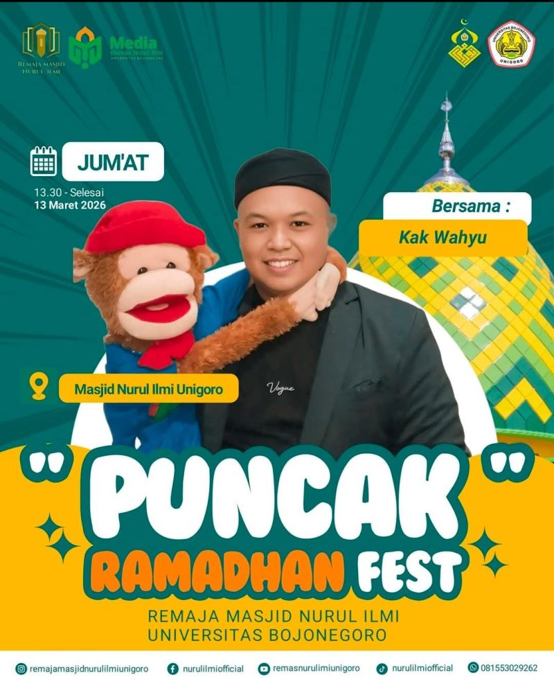 BOJONEGORO – RilisPublik – Suasana hangat penuh kebersamaan akan mewarnai kegiatan Puncak Ramadhan Fest Unigoro 2026 yang digelar pada Jumat, 13 Maret 2026 mulai pukul 13.30 WIB di Masjid Nurul Ilmi Unigoro. Kegiatan ini menjadi momentum silaturahmi sekaligus refleksi spiritual bagi mahasiswa dan para santri di lingkungan Universitas Bojonegoro selama bulan suci Ramadan.