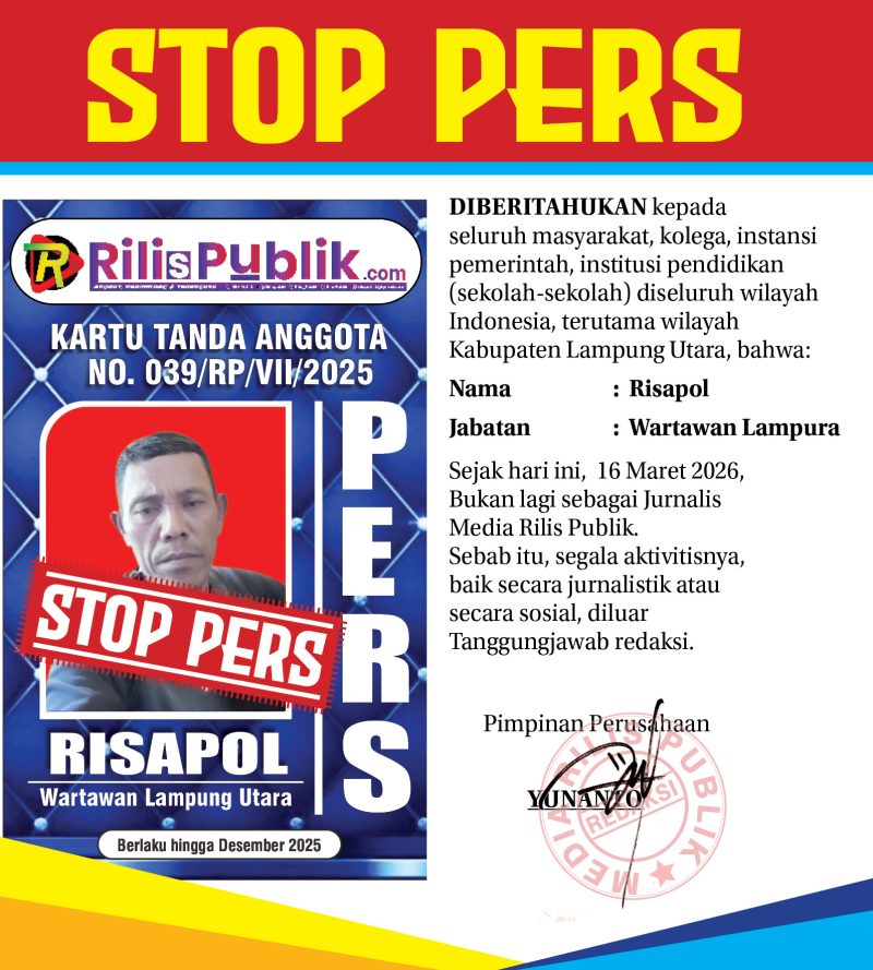 Sejak hari ini, Senin 16 Maret 2026, Bukan lagi sebagai Jurnalis Media Rilis Publik. Sebab itu, segala aktivitisnya, baik secara jurnalistik atau secara sosial, diluar tanggungjawab redaksi.
