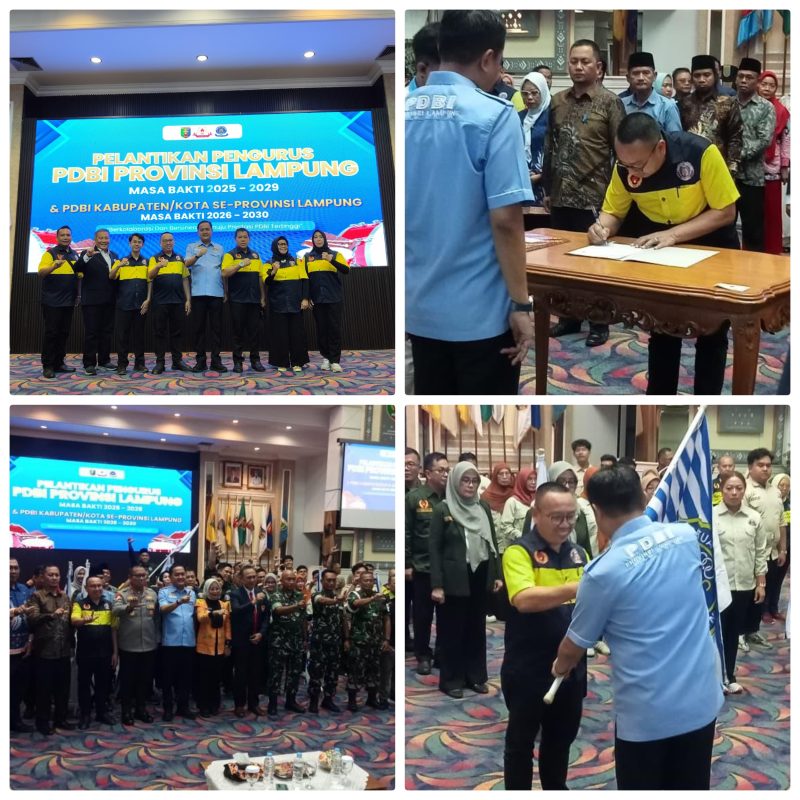 Prosesi pengukuhan berlangsung di Balai Keratun, Kantor Gubernur Lampung, pada Kamis (23/4/2026). Kegiatan tersebut menjadi bagian dari rangkaian pelantikan kepengurusan PDBI mulai dari tingkat provinsi hingga kabupaten/kota se-Provinsi Lampung.