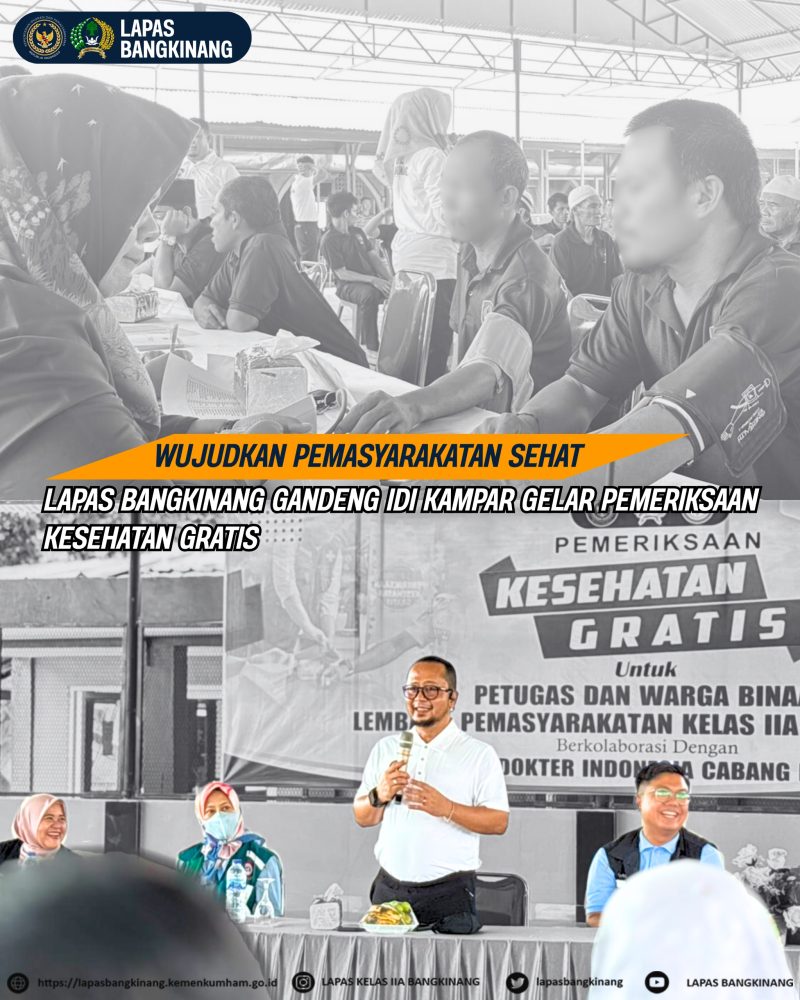 BANGKINANG, Rilis publik – Dalam upaya meningkatkan kesehatan petugas dan warga binaan pemasyarakatan (WBP), Lembaga Pemasyarakatan (Lapas) Kelas IIA Bangkinang menggelar kegiatan pemeriksaan kesehatan gratis bekerja sama dengan Ikatan Dokter Indonesia (IDI) Cabang Kampar, Sabtu (01/11/2025). Kegiatan ini menjadi wujud nyata sinergi antara lembaga pemasyarakatan dengan organisasi profesi medis dalam mendukung pemasyarakatan yang sehat dan humanis.